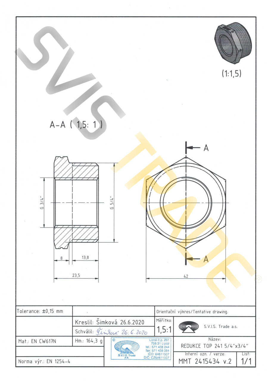 Mosiężna redukcja (przejście) MF - 241 MMT-TOP. Wyprodukowana według normy EN 1254-4 - gwintowana mosiężna złączka. Bez obróbki powierzchniowej. S.V.I.S Trade - czeski producent kształtek jest posiadaczem certyfikatów ISO 9001,ISO 14001,OHSAS 18001. Na mosiężne kształtki stosujemy ubezpieczenie szkody na całym terytorium EU. Zaprojektowane do dystrybucji wody,wody pitnej,powietrza,nieabrazyjne i nie agresywne media do dopuszczalnego ciśnienia 3,0 MPa i temperatury od -20°C do 200 °C, z koniecznością uniknięcia zamrożenia mediów. Seria kształtek TOP-spełnia wyższe wymagania dla połączeń gwintowanych. Mosiężne kształtki są produkowane z mosiądzu CW617 N. Jako materiał uszczelniający do montażu złączek mosiężnych zaleca się uzywanie taśmy teflonowej lub przewodu teflonowego. Producent NIE ZALECA używania konopi jako materiał uszczelniający. Zalecenia dla instalacji: dystrybucja wody,dystrybucja wody pitnej,dystrybucja ciepła,powietrza.