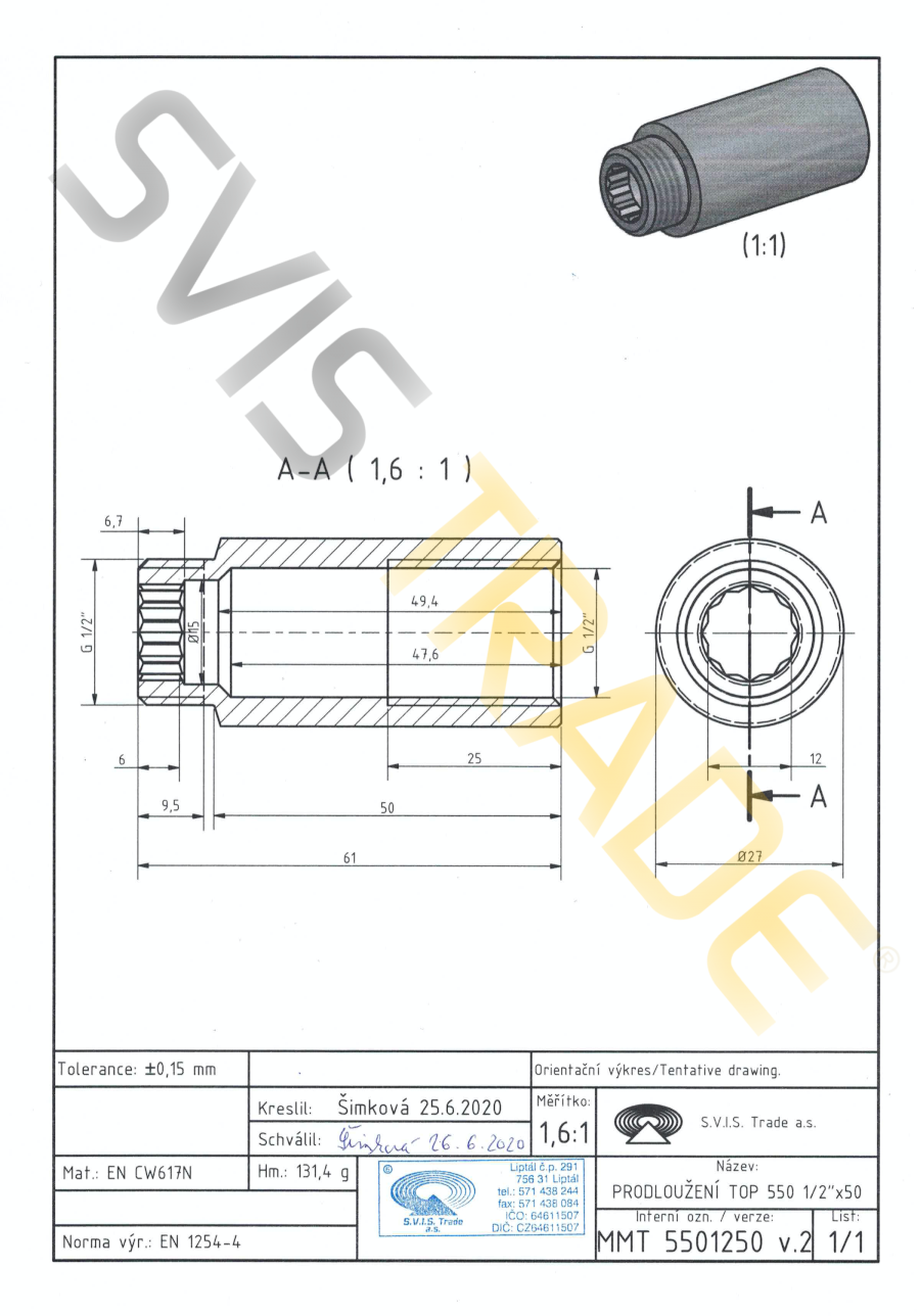 Mosiężny przedłużka MF - 550 MMT-TOP. Wyprodukowana według normy EN 1254-4 - gwintowana mosiężna złączka. Bez obróbki powierzchniowej. S.V.I.S Trade - czeski producent kształtek jest posiadaczem certyfikatów ISO 9001,ISO 14001,OHSAS 18001. Na mosiężne kształtki stosujemy ubezpieczenie szkody na całym terytorium EU. Zaprojektowane do dystrybucji wody,wody pitnej,powietrza,nieabrazyjne i nie agresywne media do dopuszczalnego ciśnienia 3,0 MPa i temperatury od -20°C do 200 °C, z koniecznością uniknięcia zamrożenia mediów. Seria kształtek TOP-spełnia wyższe wymagania dla połączeń gwintowanych. Mosiężne kształtki są produkowane z mosiądzu CW617 N. Jako materiał uszczelniający do montażu złączek mosiężnych zaleca się uzywanie taśmy teflonowej lub przewodu teflonowego. Producent NIE ZALECA używania konopi jako materiał uszczelniający. Zalecenia dla instalacji: dystrybucja wody,dystrybucja wody pitnej,dystrybucja ciepła,powietrza.