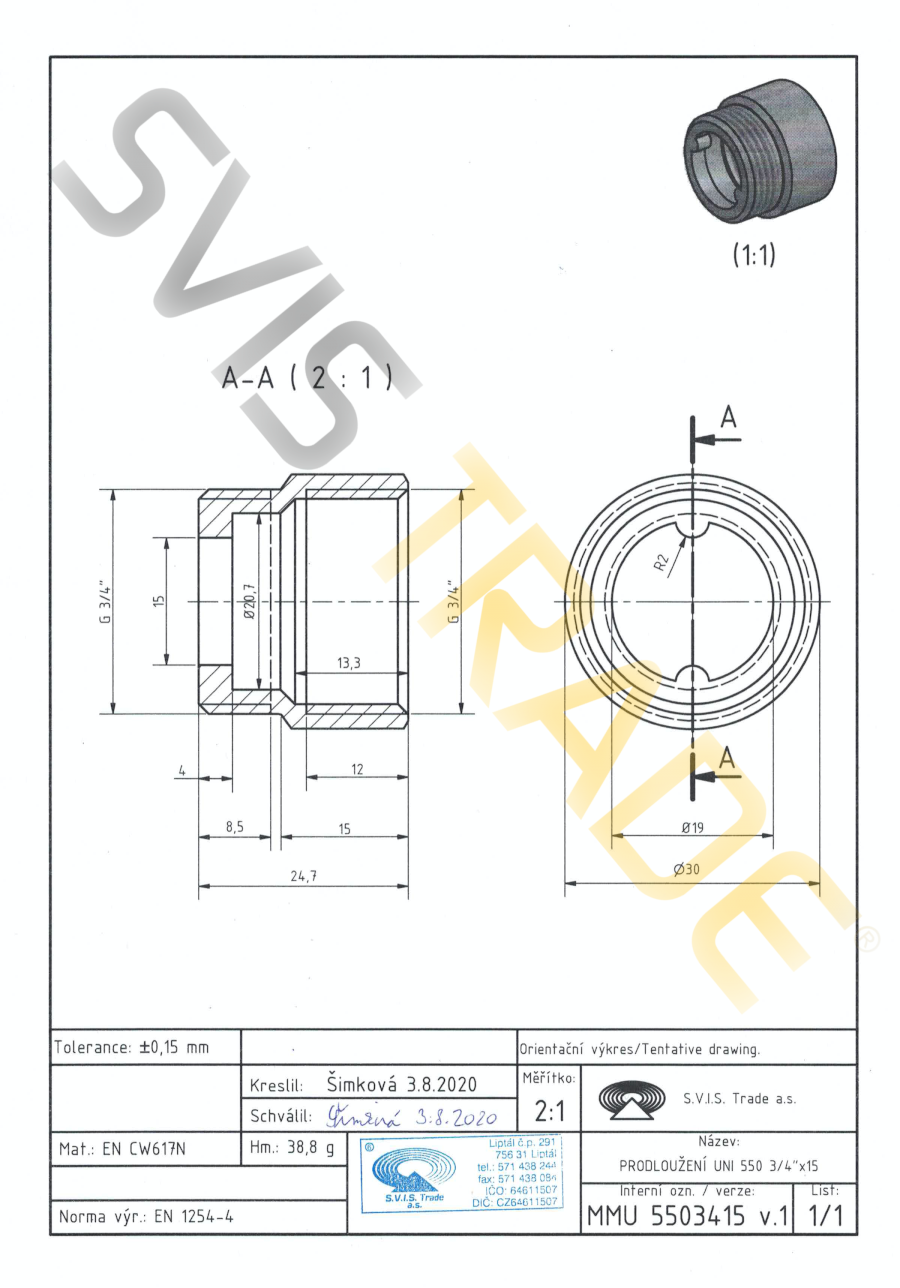 Mosiężne przedłużka MF - 550 MMU-UNIVERSAL. Wyprodukowana według normy EN 1254-4 - gwintowana mosiężna złączka. Bez obróbki powierzchniowej. S.V.I.S Trade-czeski producent kształtek jest posiadaczem certyfikatów ISO 9001,ISO 14001,OHSAS 18001. Na mosiężne kształtki stosujemy ubezpieczenie szkody na całym terytorium EU. Zaprojektowane do dystrybucji wody,wody pitnej,powietrza,nieabrazyjne i nie agresywne media do dopuszczalnego ciśnienia 1,6 MPa i temperatury od -20°C do 120 °C, z koniecznością uniknięcia zamrożenia mediów. Seria kształtek UNIVESRAL - spełniają standardowe wymagania dotyczące połączeń gwintowych. Mosiężne kształtki są produkowane z mosiądzu CW617 N. Jako materiał uszczelniający do montażu złączek mosiężnych zaleca się uzywanie taśmy teflonowej lub przewodu teflonowego. Producent NIE ZALECA używania konopi jako materiał uszczelniający. Zalecenia dla instalacji: dystrybucja wody,dystrybucja wody pitnej,dystrybucja ciepła,powietrza.
