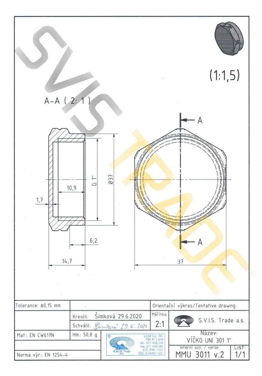 Filetul fitingurilor din alama,tip-capac cu hexagon,cu filetele tevii interioare,fara tratament de suprafata.Conectarea filetelor G,sunt paralele pentru unirea(imbinarea) nu etansarea pe filete in conformitate cu ISO 228-1.Produse in conformitate cu EN 1254-4.