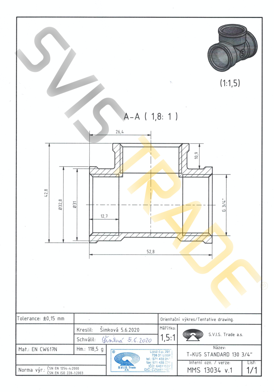 Závitová tvarovka z mosadze, druh - T-kus jednoznačný s rúrkovými závitmi vnútorný x vnútorný x vnútorné, bez povrchovej úpravy. Pripojovacie závity G sú valcové pre spoje netesniace na závitoch podľa normy ISO 228-1. Vyrobené podľa normy EN 1254-4.