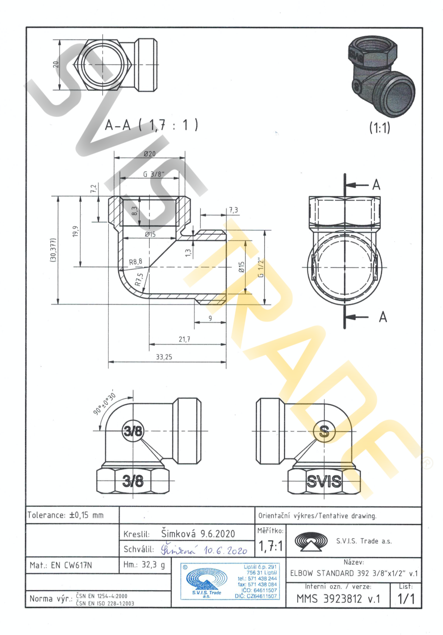 Tvarovka z mosadze CW617N. Určená pre spájanie so závitom ISO 228-1. Prevedenie: bez povrchovej úpravy.