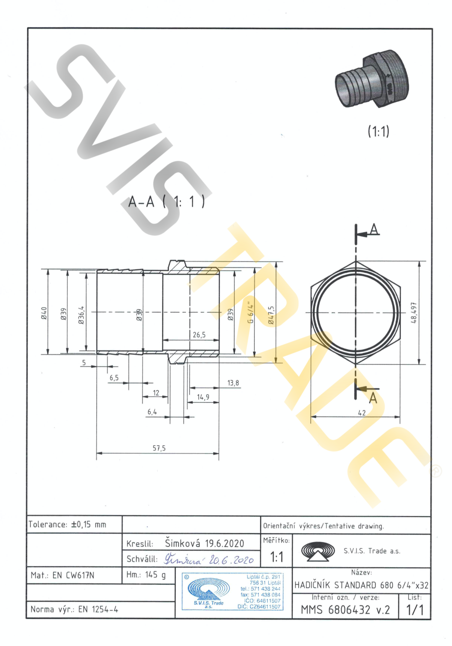 Tvarovka z mosadze CW617N. Určená pre spájanie so závitom ISO 228-1. Prevedenie: bez povrchovej úpravy.