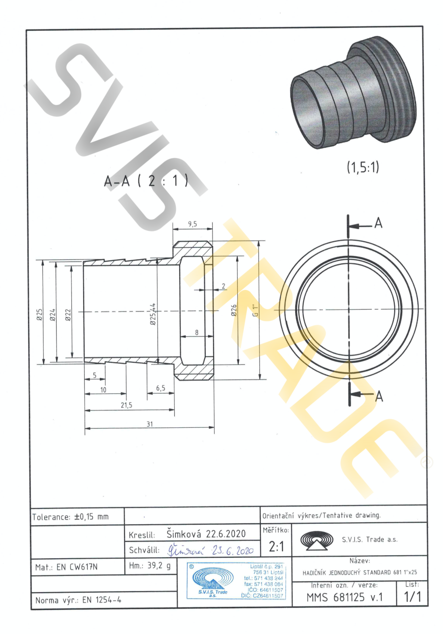 Závitová tvarovka z mosadze, druh - hadičník (adaptér na hadici) jednoduchý, bez povrchovej úpravy. Pripojovacie závity sú G valcové netesniace na závitoch podľa ISO 228-1. Vyrobené podľa normy EN 1254-4. Použitie: Určené pre použitie v potrubných rozvodoch vody (vrátane vody určenej pre ľudskú spotrebu), vzduchu a ďalších neabrazívnych a neagresívnych médií s najvyšším pracovným pretlakom 1,6 MPa pri teplote media od 0 ° C do + 120 ° C.