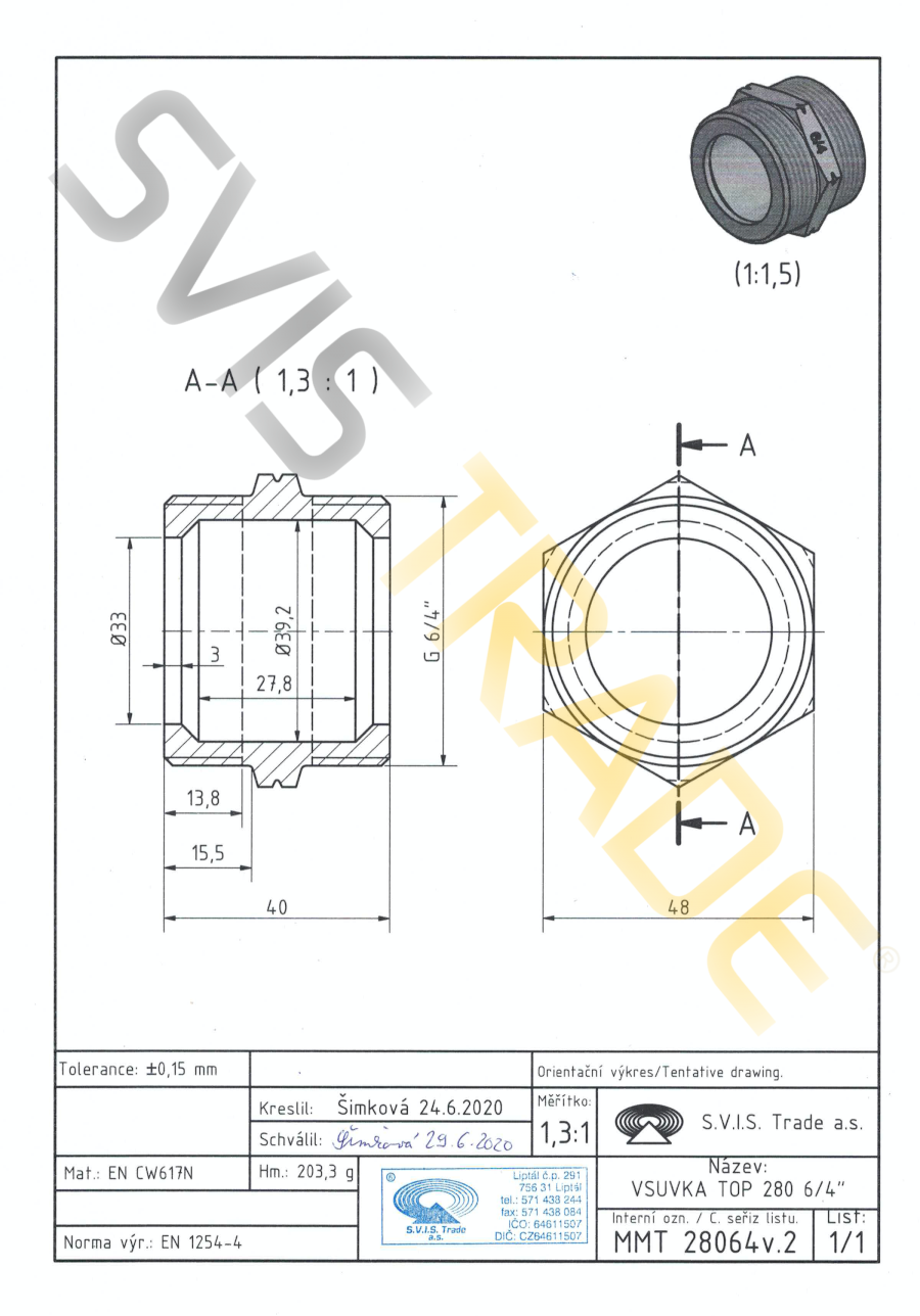 Závitová tvarovka z mosadze, druh - vsuvka s 6-hranom, s rúrkovými závitmi vonkajšie x vonkajšie, bez povrchovej úpravy. Pripojovacie závity G sú valcové pre spoje netesniace na závitoch podľa normy ISO 228-1. Vyrobené podľa normy EN 1254-4.