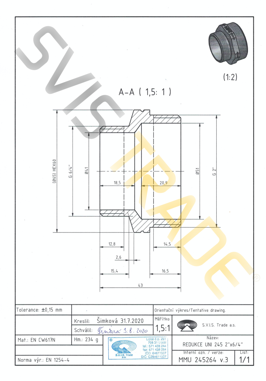 Závitová tvarovka z mosadze, druh - vsuvka redukovaná s rúrkovými závitmi vonkajšie x vonkajšie, bez povrchovej úpravy. Závity sú valcové pre spoje netesniace na závitoch podľa normy ISO 228-1. Vyrobené podľa normy EN 1254-4.
