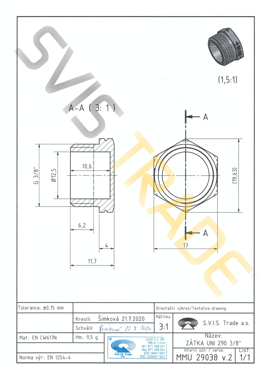 Závitová tvarovka z mosadze, druh - zátka s 6-hranom, s rúrkovým závitom vonkajším, bez povrchovej úpravy. Pripojovacie závity G sú valcové pre spoje netesniace na závitoch podľa normy ISO 228-1. Vyrobené podľa normy EN 1254-4.